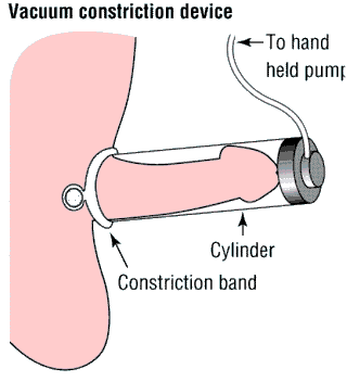 A vacuum device causes an erection by pulling blood into the penis.